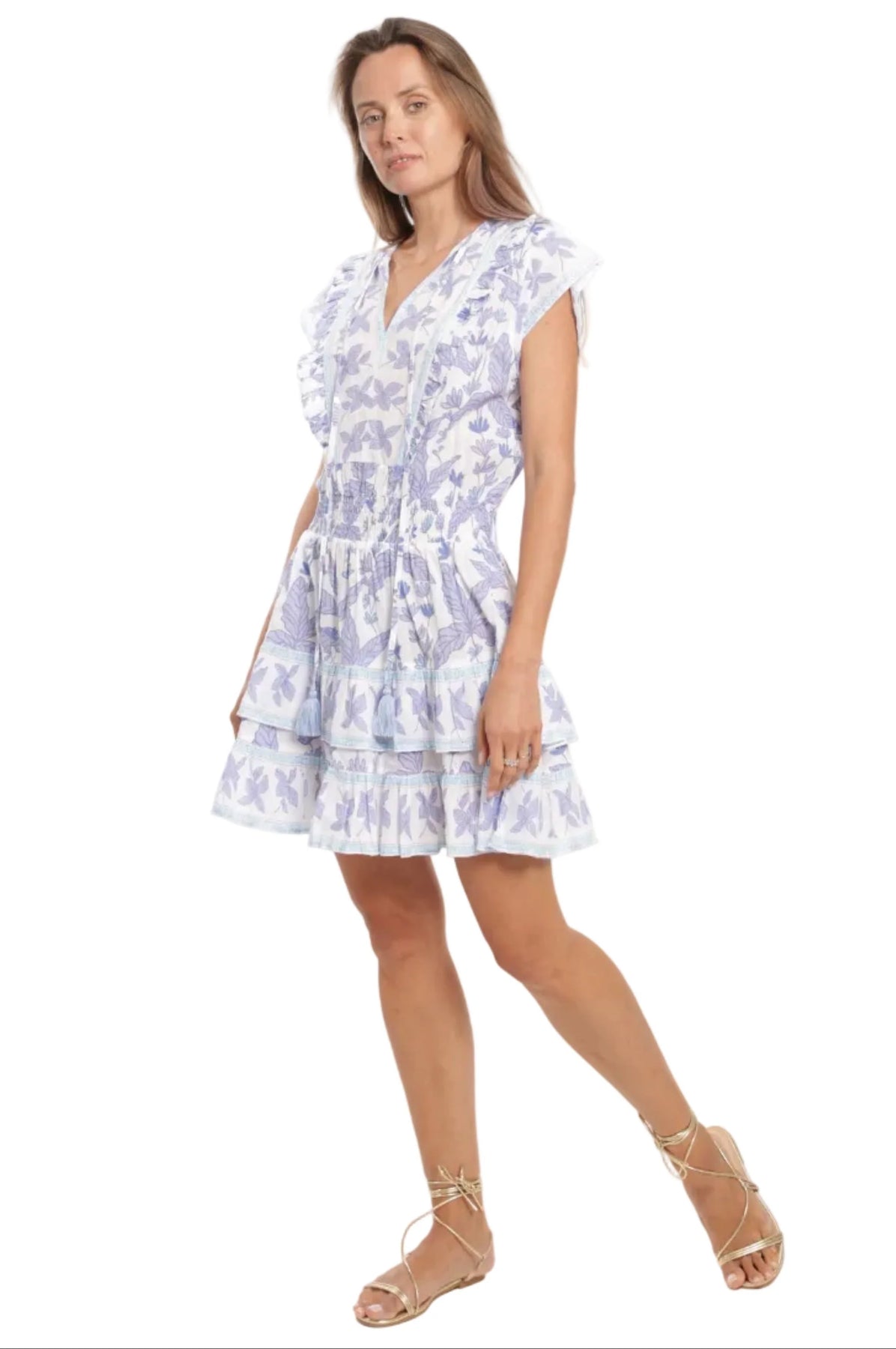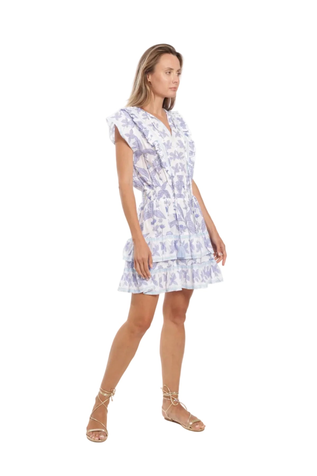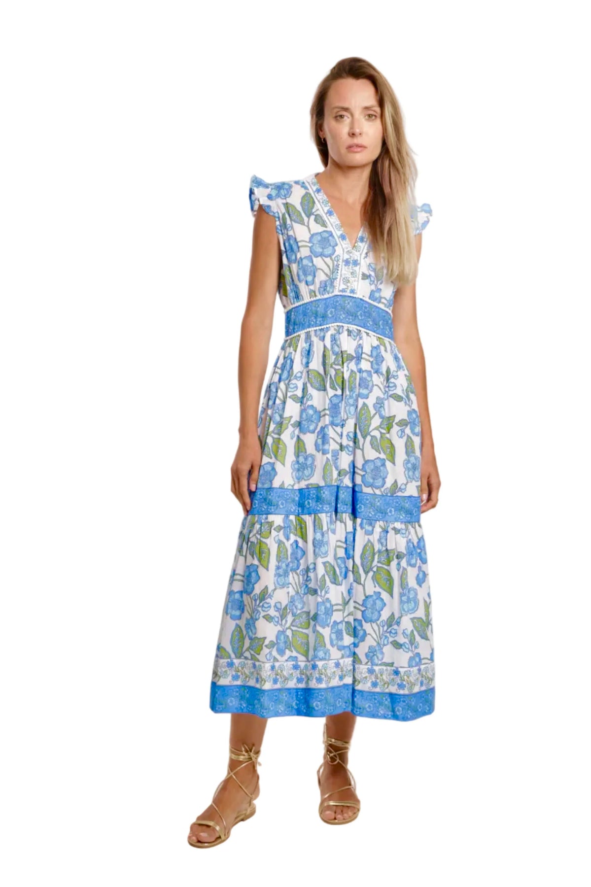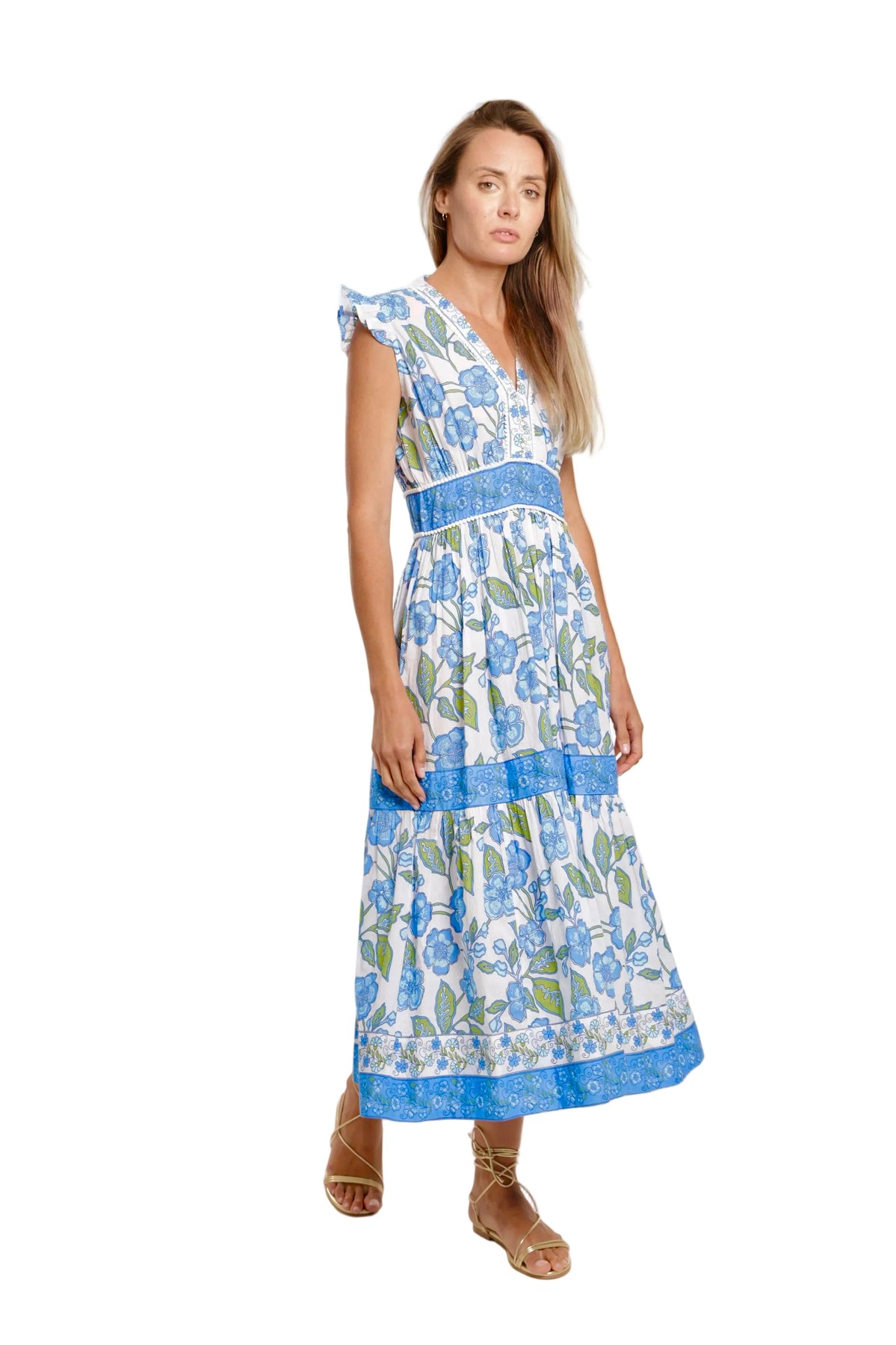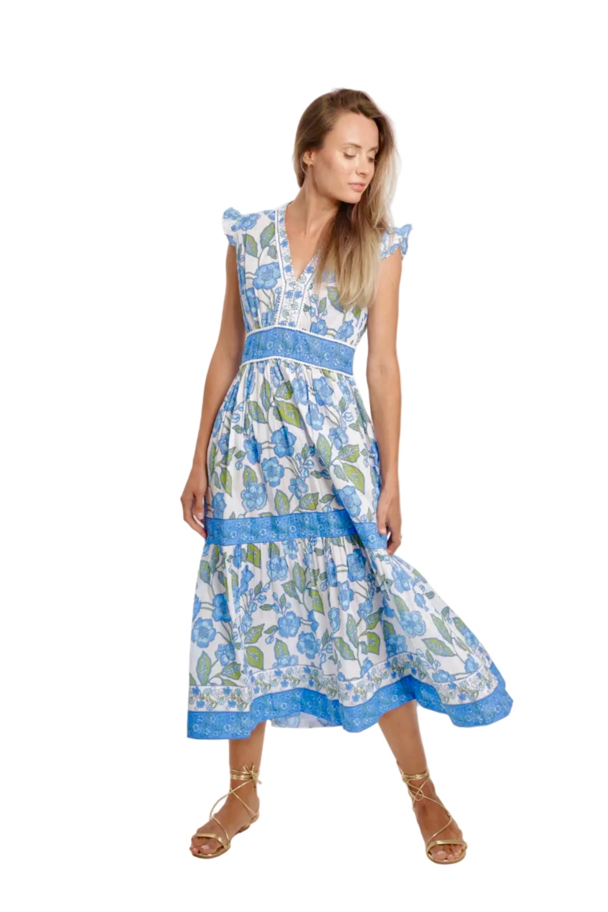 Regular price $225.00 Save Liquid error (snippets/product-template line 131): Computation results in '-Infinity'%The Celine Dress in Fleur Bleu is a beautifully feminine silhouette crafted from soft, breathable cotton. Flutter sleeves and a gently fitted V-neckline frame the bodice, while the tiered skirt adds graceful movement with every step. A hidden side zipper ensures a smooth, flattering fit without interrupting the print. The Fleur Bleu design blends rich blue florals with coordinating border trims that accent the waist and hem. Light, elegant, and effortlessly wearable, the Celine Dress is perfect for warm-weather days and relaxed weekend moments.